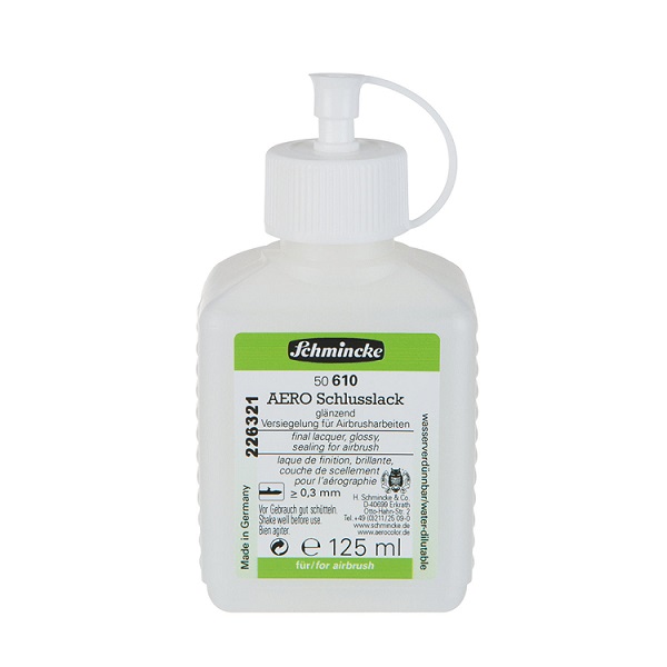 Aero Schlusslack Schmincke 125 ml trattamento di finitura LUCIDO per aerografo Trattamento di finitura senza solvente. La lacca lucida Schmincke è di notevole durevolezza; quando essicata forma una patina elastica e resistente ai graffi. La finitura lucida restiuisce un effetto di omogenea lucentezza e brilantezza. Pronta all'uso, può essere applicata direttamente con l'aerografo. Flacone da 125 ml Recensioni