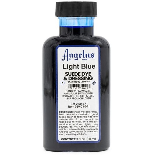 Home Page » Catalogo » Colori » Colori per pelle, cuoio e tessuti » Colori Angelus SUEDE DYE (a base alcolica) » ANGELUS SUEDE DYE Colore per pelle scamosciata - LIGHT BLUE 88,5 ML
