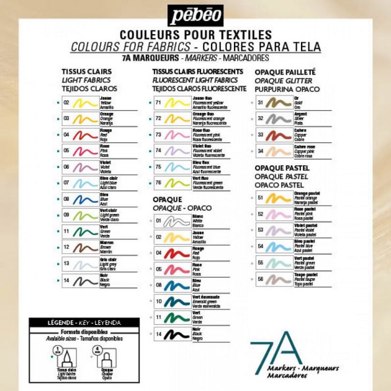 7A Marker è una gamma di pennarelli di qualità professionale per tutte le applicazioni su tessuti chiari e scuri. I pennarelli 7A sono un modo semplice per personalizzare e decorare i tessuti, sono a base d'acqua e possono essere utilizzati sulla maggior parte dei tessuti, tra cui denim, lino, cotone, maglieria, jersey, velluto, jacquard, poliestere, fibre miste e non tessuti. L'asciugatura richiede circa 2 ore. I colori sono brillanti e possono essere lavati a 40°C dopo averli fissati per 5 minuti con il ferro da stiro, senza vapore. Recensioni