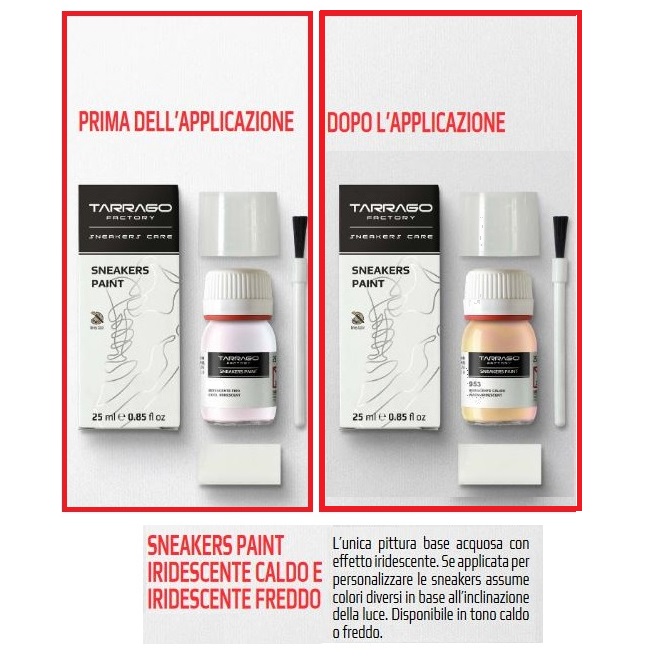 Tarrago Sneakers Paint è un colore acrilico a base d'acqua, appositamente studiato per cambiare colore, personalizzare o ripristinare le sneakers in pelle liscia, sintetica o tessuto. Grazie alla concentrazione di pigmenti di alta qualità, ha un elevato potere coprente. Una volta asciutto è completamente impermeabile, resiste a più di diecimila flessioni, evitando che si screpoli o si distacchi. Per fissare meglio il colore e proteggerlo dai graffi, è consigliato l'utilizzo di un Maker finale (adatto solo alla pelle). Per l'utilizzo con i tessuti, miscelare il colore con il Soft Maker. Utilizzare il Deglazer per eliminare la finitura di fabbrica e consentire il fissaggio del colore. Può essere utilizzato con l'aerografo, con ago da 0.5 mm. Per misure inferiori diluire con Neutral Base. La gamma comprende colori standar, pastello, metallizzati, glitter, fluorescenti, effetti speciali, prodotti ausiliari. Flacone da 25 ml Recensioni