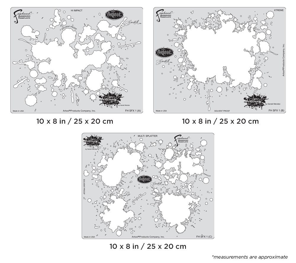 FHSFX1 - SPLATTER FX SET "Hi Impact - Xtreme - Multi Splatter" Stencil Artool Freehand Airbrush Templates by Gerald Mendez. La confezione contiene 3 Stencils FHSFX1 Splatter FX "Hi Impact - Xtreme - Multi Splatter" by Gerald Mendez. Dimensioni: 20,5 x 25,5 cm.