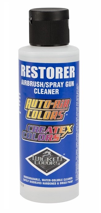 Super pulitore non tossico, biodegradabile che aiuta a sciogliere il colore secco nell'aerografo, ripristinandolo mediante immersione o strofinando la parte che necessita di pulizia. Non spruzzare con l'aerografo, ma utilizzarlo solo per immersione. Risciacquare accuratamente l'aerografo dopo l'utilizzo di restorer, per evitare qualsiasi contaminazione con il colore: restorer ha una composizione simil-oleosa che non si mescola bene con i colori a base acqua. Il prodotto è riutilizzabile in quanto il sedimento precipita. Recensioni